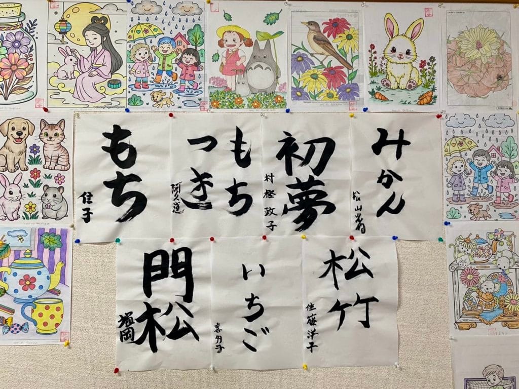 利用者さまは「もち」「雪」「もちつき」「初夢」「みかん」「門松」「いちご」「松竹」など、1月(新年)にちなんだお習字を楽しみました〜😲