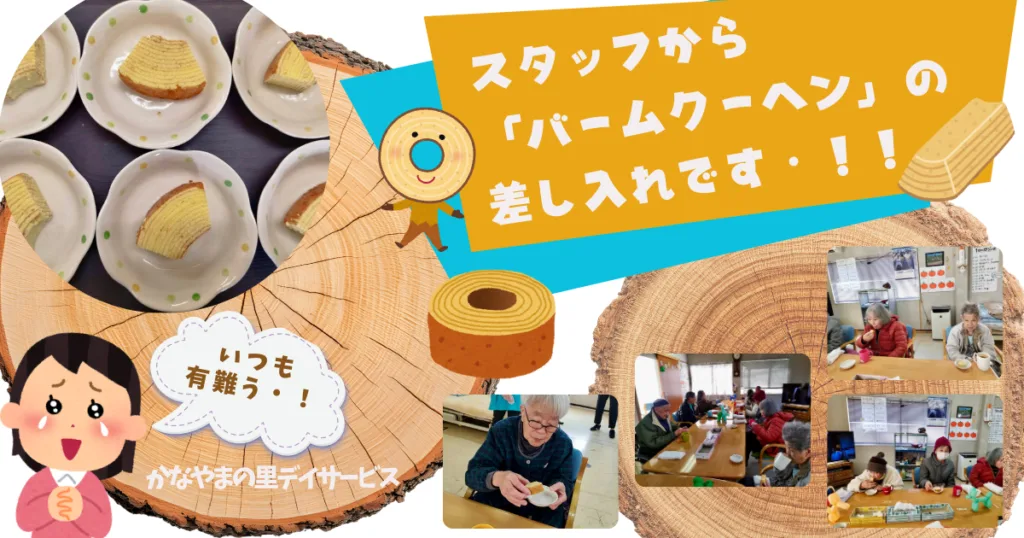 かなやまの里では、「バームクーヘン」の差し入れをいただきました・!